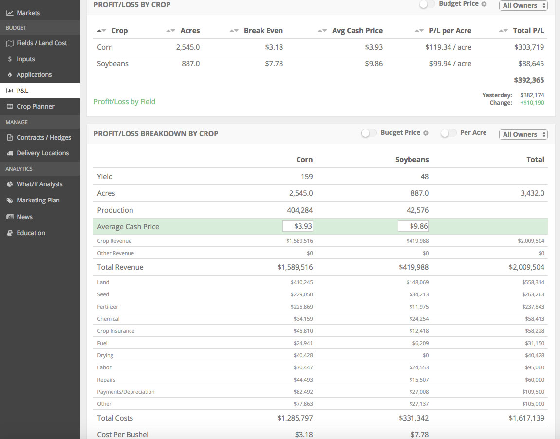 Grain marketing in today’s volatile environment is harder than ever. Our real-time* farm P&L will help you focus on what matters, your farm’s bottom line. In addition, our grain marketing plan builder will allow you to build a profit-focused marketing plan. You’ll receive notifications when your plan’s price and/or date targets have been met. This allows you to focus on raising crops instead of fixating on market prices which none of us have any control over.